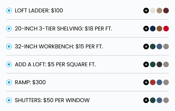 Enhance your ShedMax building with our wide range of custom extras and upgrades. From doors and windows to shelving and insulation, choose the options that best fit your needs and style.
